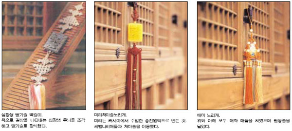 궁중에서는 5월 단오절에 백옥과 비치로 된 외줄노리개를 달고, 8월 추석에는 삼작노리개를 달았다고 한다. 민간에서는 주로 은삼작을 달았는데 혼례 때 사용하고 나면 평생 간직할 요량으로 장롱 깊숙이 간직하곤 했다. 바로 그 노리개의 품위와 멋스러움을 돋보이게 하는 것이 매듭이니 매듭이란 그가 말하는 것처럼 주연 아닌 조연이지만 사실은 주연 못지않은 조연인 셈이다. 매듭은 여인네의 전유물은 아니다. 선비들이 한 여름에 쓰는 부채 끝에 다는 선추에도 매듭은 다소곳이 자리하고 있으며 죽은 사람의 길을 인도하는 인로왕보살의 이름을 쓴 깃발인 인로왕번에도 매듭은 지어져 있다.