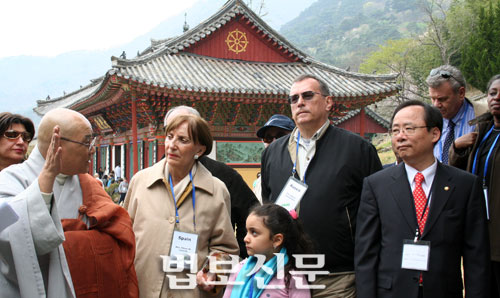 | <사진설명>주지 청운 스님이 표충사를 찾은 외국인들에게 한국의 불교문화에 대해 설명하고 있다. |