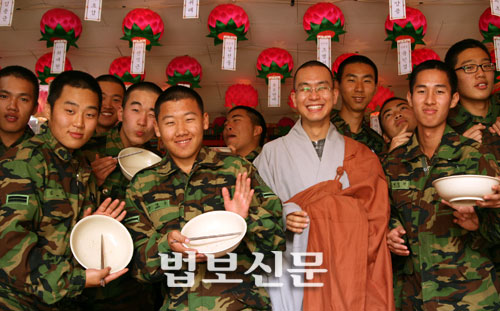 실제 이날 법회에 참석한 장병들 대다수는 “초코파이보다 쫄깃한 국수면발이 훨씬 좋다”고 답했다. 사단 본부에서 근무하고 있는 이창하 일병은 “언젠가 훈련병 어머니가 법당에 보시한 치킨을 먹던 날을 잊을 수가 없다”며 “법당에서 부침개나 햄버거 등이 나온다는 소식이 들리면 그 주에는 법당에 발 디딜 틈도 없이 병사들로 꽉 찬다”고 강조하기도 했다.