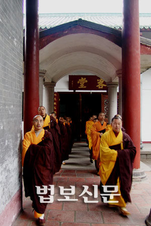 | <사진설명>육조 혜능 스님의 행화 도량인 조계 남화선사 대중 스님들이 예불 시간에 맞춰 대웅보전으로 향하고 있다. |