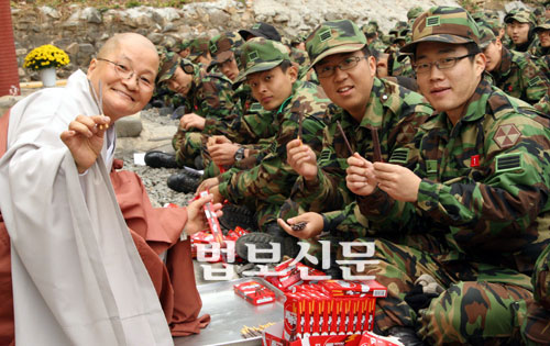 온통 칭찬 일색이다. 공통된 의견은 병사들의 마음을 잘 헤아려 준다는 것. 민간인 성직자인 스님이 이토록 병사들의 마음을 잘 헤아릴 수 있는 것은 20년이 넘은 ‘짬밥’ 덕택이다. 또 스님은 이 지역에서만 12년째 군포교에 매진하고 있다. 그만큼 ‘군’이라는 조직에 대해 잘 알고 병사들의 심리도 잘 알고 있는 것이다.