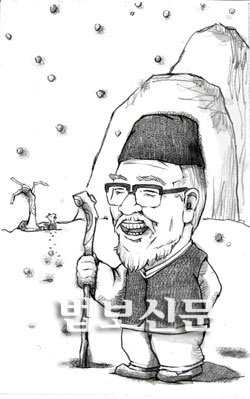 “허허, 꼭 만나 뵙고자 하는 외고집이 있거든 허공을 향하여 한 걸음 내어 디디세요. 그 곳에는 흰 머리카락을 휘날리는 유마 거사님이 눈을 껌벅이며 계실 것입니다.”