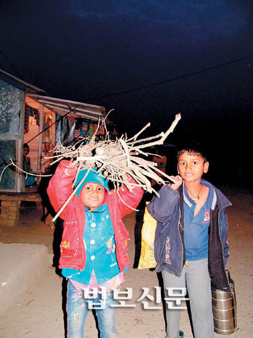 | 밤새 땔감으로 쓸 나무를 줍고 쓰레기 더미에서 쓸만한 물건을 한 아름 모아 집으로 향하는 아이들. |