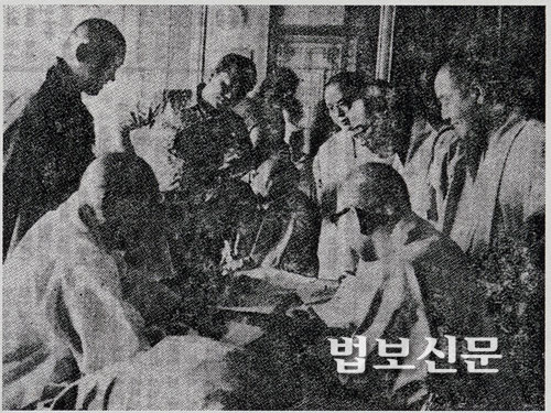 | 개운사 측과 조계사 측이 분규 해소를 위해 합의서에 서명하는 장면. |