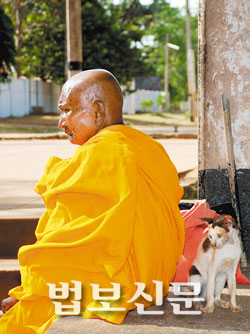 탑을 올려보다 목이 아파 절로(?) 고개를 숙이니 스리랑카 불자들이 기도를 올리고 있었다. 하얀 사리를 입고 앉았다. 눈 한번 뜨지 않았다. 그 엄숙한 경계에 가만히 발을 디뎠다. 옆에 가만히 서 본다. 꿈쩍도 않는다. 부처님이라도 감탄하고 남을 지경이다. 그들이 눈치 채지 않게 카메라를 고정시켰다. 셔터 소리에 놀란 건 오히려 순례자였다. 혹여 방해됐을까 황망히 발을 돌렸다. 탑돌이를 한 후 루완웨리세야 대탑을 등지고 차로 향하다 입구서 재미있는 순간을 포착했다. 어느 노 비구니가 뙤약볕에 앉아 있는데 슬금슬금 삐쩍 마른 고양이 한 마리가 다가오는 것이 아닌가. 삐쩍 마른 고양이와 비구니의 시선이 묘한 동질감을 느끼게 한다. 볕을 피해 비구니의 그늘에 당당히(?) 들어온 고양이. 먹을 것 찾다 지쳤는지 도통 기운이 없어 보였다. ‘그래 잠시 더위를 피하렴. 잠시 생을 위한 몸부림을 내려두렴. ’‘그래요 스님. 오랜 고행 잠시 놓고 쉬세요.’