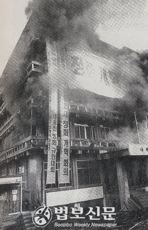| 1998년 조계종 분규로 화염에 휩싸인 조계종 총무원 청사. |