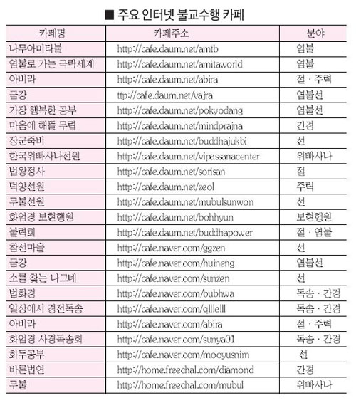 주요 포털사이트에는 현재 불교카페 및 불교커뮤니티가 다음(http://cafe.daum.net) 1만1160여 개, 네이버(www.naver.com) 3860여 개, 프리첼(www.freechal.com) 320여 개 등 모두 1만5000여 개에 이른다. 이들 카페 대부분 포교, 친목단체, 사찰순례, 봉사, 찬불가 등을 성격이 강하지만 수행에 관한 전문성을 갖추고 내용을 꾸준히 업그레이드 하는 튼실한 카페들도 적지 않다. 특히 적게는 수십 명에 불과하지만 많게는 수만 명이 가입해 활동하는 곳도 있으며, 염불, 선, 절, 사경, 독송, 주력, 위빠사나 등 종류도 다양해 초심자는 물론 좀 더 깊이 있는 수행정보를 필요로 하는 베테랑 불자들에게도 큰 도움이 될 수 있는 카페도 많다.