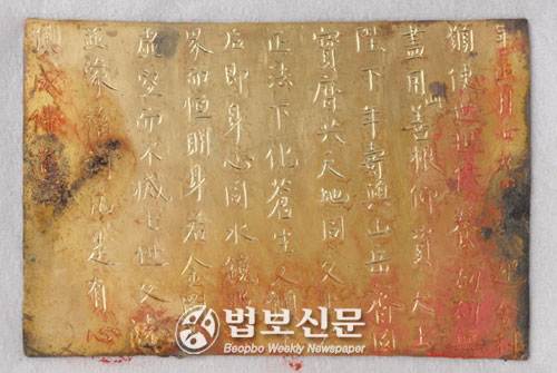이 금종이쪽은 사리차림 남쪽의 위쪽에, 글자마다 붉은 칠朱漆을 넣은 앞면이 보이게 놓여져 있었다. 하지만, 뒷면의 글씨에는 칠을 넣지 않아 궁금증 인다. 왼쪽서 나아가는, 깔끔端正·端整한 세로 해서체로 필력과 서각書刻 솜씨가 돋보이며 또렷하여 누구나 알아 볼 수 있다.