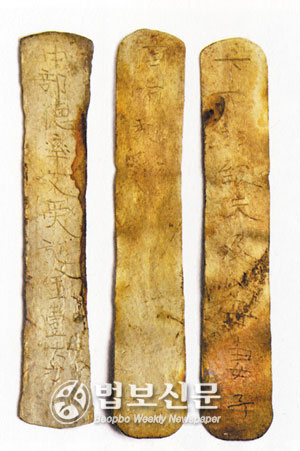 더불어, 금종이 밑에 놓여 어지러이 포개지고 흩어진 18점이나 되는, 좁고 길며 얇게 편 금조각(金片, 8×1.5㎝)들에 또한, 이 불사에 동참하여 공양한 상급 벼슬아치들도 새겨져線刻 있어 살펴진다.