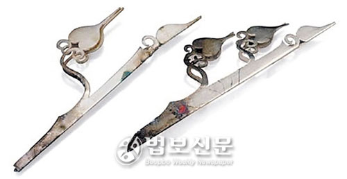 뿐만아니라 이들 금조각과 함께, 좁고 얇은 은판을 굽혀붙여 꽃가지꼴로 오려만든 은꽃관치레銀花冠飾도 2점이 같이 나왔다. 달솔과 덕솔들을 비롯해 벼슬아치 모두가 은꽃관을 쓴다고 알려진데다, 꽃봉오리가 1단과 2단짜리 은꽃관이 공양되어 있어 또 다른 급수의 벼슬아치 동참도 알려주는 것!