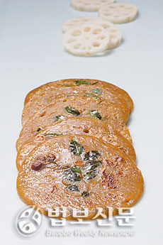 ‧연근가루를 먼저 물에 풀고 밀가루와 조피가루를 섞어 반죽을 한다.