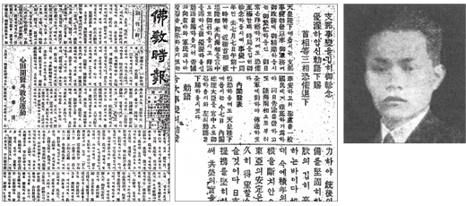 | 한국불교의 최초신문 불교시보 창간호(맨왼쪽)와 일본내각의 발표문을 실은 37호(가운데). 그리고 발행인 김태흡(오른쪽). |