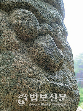 오른쪽의 남장승-아저씨는 그냥 뾰족 상투에, 콧망울 가 주름을 내(어) 광대가 드러나고 마른 좁은 (아래)턱에, 방울눈 사이로 시계추같은 긴 주걱코하며, 길게 一(자)꼴로 다문 입꼬리가 살짝 처지며 얇고 작은 밑입술 가로 내린 八(자)꼴 도깨비 송곳니의 시침떼는(?) 싸늘한 찬 모습을 부린 솜씨가 서로 눈길 사로잡는 것!