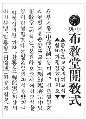 또한 개교식에는 만해를 비롯한 개혁세력 스님들이 다수 참여한 가운데 백용성이 포교의 책임자인 개교사장 자격으로 법을 설했고 학생들의 주악과 창가가 동원되기도 했다. 그러나 총독부가 시비를 걸어 간판 철거 명령을 내림에 따라 문을 연지 한 달 만인 1912년 6월 26일 간판을 내릴 수밖에 없었다. 하지만 만해와 백용성은 그대로 물러서지 않고 곧바로 조선선종중앙포교당으로 전환해 3년여 동안 포교활동을 펼쳤다.