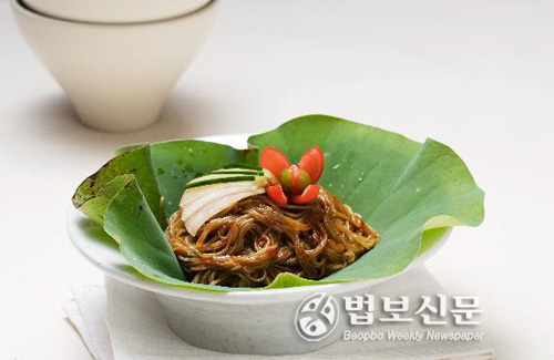 연잎을 이용하여 만든 냉면에 각종양념을 버무려 비빔냉면을 만들어 먹으면 다양하게 영양을 섭취할 수 가 있고 입맛을 잃기 쉬운 여름철 음식으로 좋다. 연잎은 무더위로 인한 갈증과 열을 멎게 하고 스트레스를 해소시키는 좋은 식재료이며 인, 철, 비타민, 아미노산이 풍부한 영양식품으로 지혈, 불면, 해독, 성인병, 고혈압, 노화, 치매, 우울증 등 예방과 치료의 효능이 있다