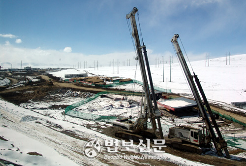 | 4000m 고원의 들녘에도 거대한 기중기를 설치해 개발에 열을 올리고 있는 중국의 욕심은 티베트의 소박함과 대조를 이룬다. |