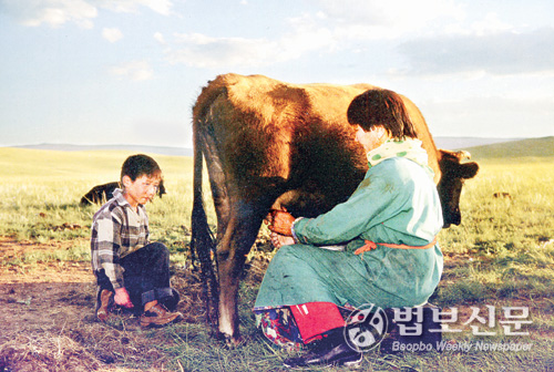 | 초원의 어머니와 아이는 수테차를 끓이기 위해 아침부터 가축의 젖을 짠다. |