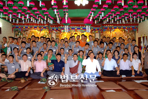 | 8월 23일 호국 용마사에서 열린 일요법회에 참석한 군장병들이 부처님 가르침을 되새기고 있다. |