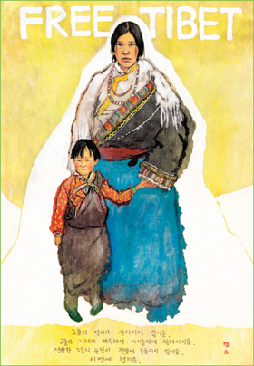 | 우리는 언제까지 라싸에서 티베트 순례자들의 맑은 영성을 가만히 바라볼 수 있을까. 티베트의 독립을 지지하는 한국의 불자와 활동가들이 제작해 배포한 티베트의 어머니와 아이의 모습이 담긴 포스터, 한 없이 맑고 순수한 티베트의 영성이 느껴진다. 포스터=전진경 작가 |