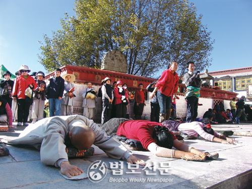 | 라싸 순례의 지도법사인 충주 석종사 금봉선원장 혜국 스님이 조캉 사원 앞에서 티베트 순례자들과 함께 오체투지를 하고 있다. |
