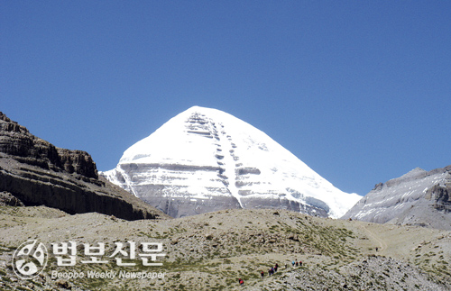 | 세계 제일의 성지 강 린포체(카일라스)가 순백의 화관을 쓴 듯 그 모습이 장엄하고 신이하다. 강 린포체의 좌우에 있는 봉우리들은 강 린포체를 주불로 받드는 보살님들로, 세 분의 불보살님들은 히말라야와 티베트 고원이 빚은 ‘자연의 삼존불’이다. 강 린포체를 향해 가는 순례자들의 행렬이 마치 개미들의 행렬처럼 작게 보인다. 사진제공=일광여행사 |