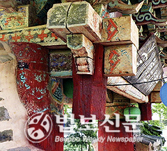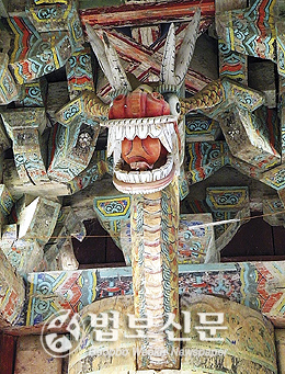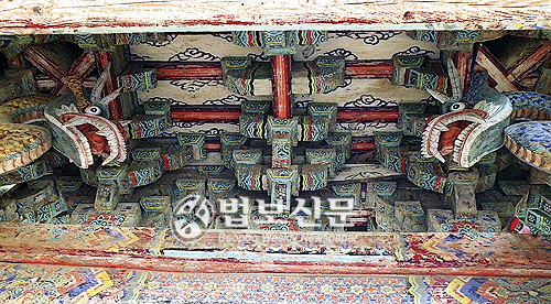 더 있다. 천장 곧, 보꾹을 쳐다보라! 두 기둥이마서 빠져나온 큼직한 용=미르龍가 마주해 지키고 있다! 왼쪽은 금-누른미르黃龍, 오른쪽은 푸른미르靑龍. 빛깔도 곱다. 길게 S꼴로 사린 몸매에 등갈기 힘차다. 쩍 벌린 입에, 혀끝을 살짝 내밀고 구슬여의주을 물고 있다.