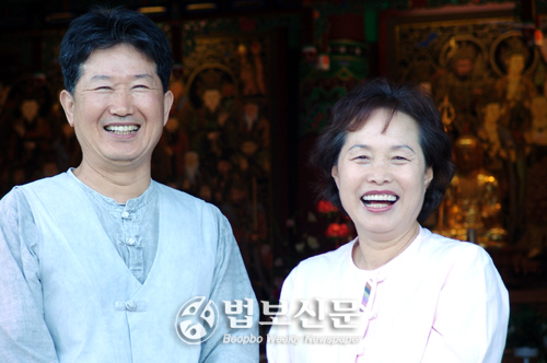 | 한사코 사진 찍기를 거부한 이근자 보살이 남편 김근수 법사 앞에 섰다. 김 법사는 거의 10년만에 같이 사진을 찍는 것 같다며 활짝 웃어보였다. |