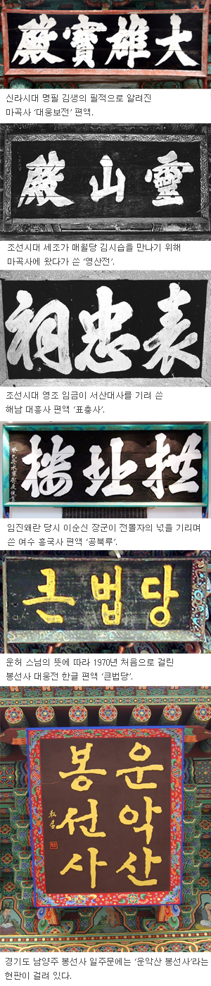 이어 1970년에 처음으로 한글 편액이 등장했다. 경기도 남양주 봉선사 대웅전은 역경사업에 크게 관심을 기울여온 운허 스님이 1970년 법당을 재건하고 ‘큰법당’이라는 편액을 내걸었다. 또 주련 역시 우리말로 알기 쉽게 풀어써서 많은 사람들로 하여금 새로운 사찰의 모습을 느끼게 했다. 편액이 건물의 얼굴이라는 점은 한문을 한글로 바꿔 달은 데서 느끼는 색다름에서도 잘 나타난다. 봉선사의 ‘큰법당’ 편액은 경북 선산 출신의 서예가 운봉(雲峯) 금인석(琴仁錫)이 쓴 것으로 알려져 있다.