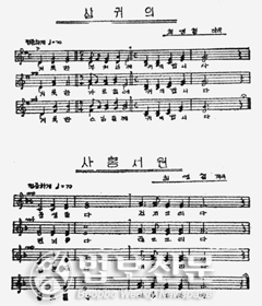 | 1970년 종립학원연합회가 주최한 찬불가 공모에 당선된 대전 보문고 최영철 교사의 ‘삼귀의’와 ‘사홍서원’. |