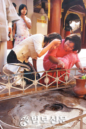 쉐지곤파고다 앞에서 고개를 숙여야 되는 이유는 또 하나있다. 파고다 아래 바닥에는 야구공만한 홈이 파여 있고 그 안에 물이 고여 있는데 지나가는 사람들마다 그 앞에 무릎을 꿇고 앉아 물속을 뚫어져라 쳐다본다. 물위로 파고다의 꼭대기가 비춰지기 때문이란다. 이 홈은 원래 왕이 파고다 꼭대기를 바라보며 기도를 올리기 편하도록 만들어 놓은 것이다.