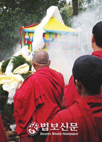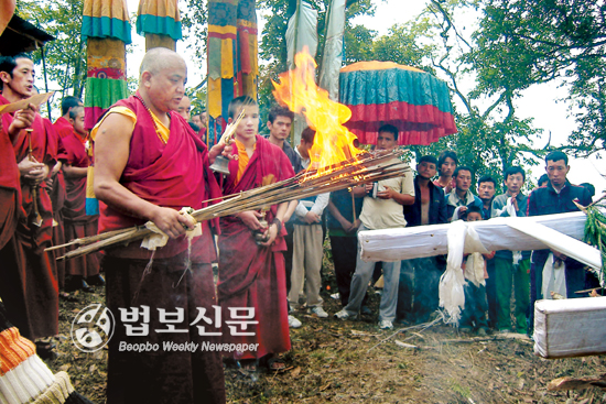 | 다비식에서 불을 붙이는 린포체. |