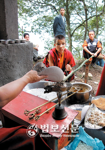 | 불자들이 올린 공양물에 버터를 붓고 있는 린포체. |