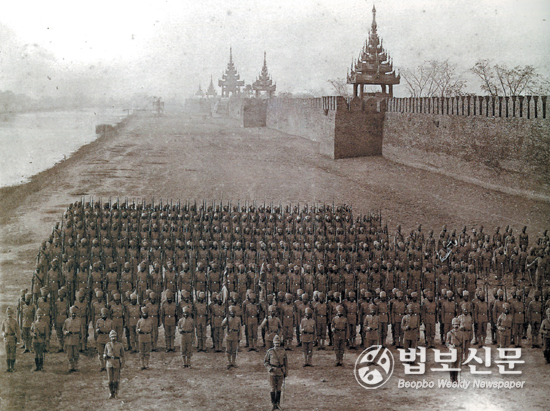 | 영국의 식민지가 된 후 만들레이성은 영국군의 요새로 사용됐다. 사진은 1890년 촬영한 영국군 장교와 인도인으로 구성된 군대의 사열 모습. |