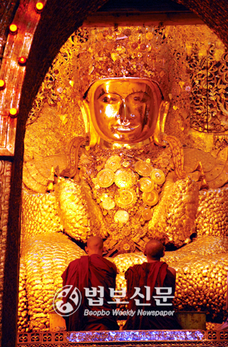 | 미얀마 3대 불교 성지의 하나로 손꼽히는 마하무니 파고다의 불상. 라카잉 지방에서 이 불상을 빼앗은 보드퍼야 왕은 138개의 산을 넘어 불상을 이운해 왔다. |
