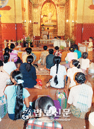 | 마하무니 파고다에선 여자들이 불상 가까이에 다가 갈 수가 없다. |