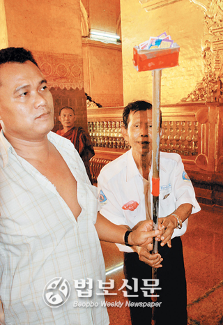 | 마하무니 파고다에선 여자들을 대신해서 불상에 금박을 붙여주는 대리인이 있다. |