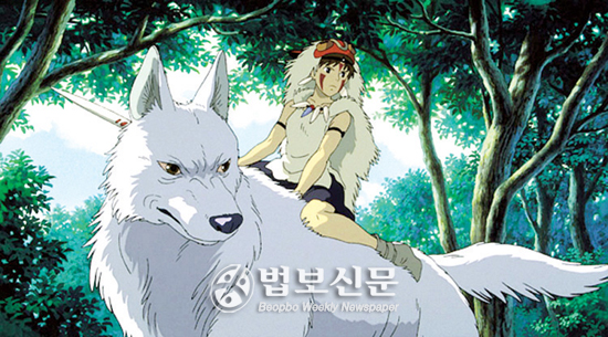 | 인간의 욕망에 맞서 숲을 수호하는 모노노케 히메와 들개. |