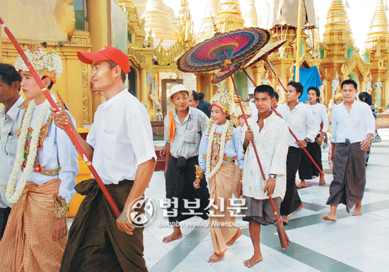 한 낮의 태양빛을 고스란히 받아 눈부시게 발산하고 있는 쉐다곤파고다의 하얀 대리석 바닥은 이미 한 발 내딛기조차 버거울 만큼 뜨겁게 달아올라있다. 하지만 그 사원 곳곳에서 펼쳐지고 있는 신쀼 의식과 스님들의 순례, 청년들의 토론, 그리고 사원 곳곳을 뛰어다니며 해맑은 웃음을 터트리는 아이들로 인해 사원은 태양빛 보다 더 밝게 빛나고 있다.