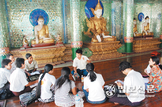 | 미얀마 사람들에게 사원은 예배의 공간인 동시에 모임, 공부, 휴식이 모두 이뤄지는 생활공간의 연장이다. 법당에 앉아 불교에 대해 공부하고 있는 미얀마 청년들의 모습에서 미얀마 불교의 미래를 발견할 수 있다. |