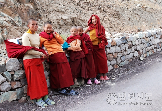 그런데 그냥 평범하고, 조금은 지루할 것 같던 도보길에 동행이 있다. 200여 미터 앞에 꼬마 스님 다섯 명이 올망졸망 무리를 지어 가고 있는 것이다. 스님들도 우리를 보았는지 뒤를 힐끔 거리며 간간히 웃음을 터뜨린다. 자세히 보니 촘마라고 불리는 사미니 스님들이다. 상자 하나와 보따리 몇 개를 서로 번갈아가며 들고 있다. 제법 묵직해 보인다. 걸음을 조금만 빨리하면 따라 잡을 것 같아 발길을 재촉한다. 얼마 되지 않아 촘마들과 나란히 걷게 됐다.