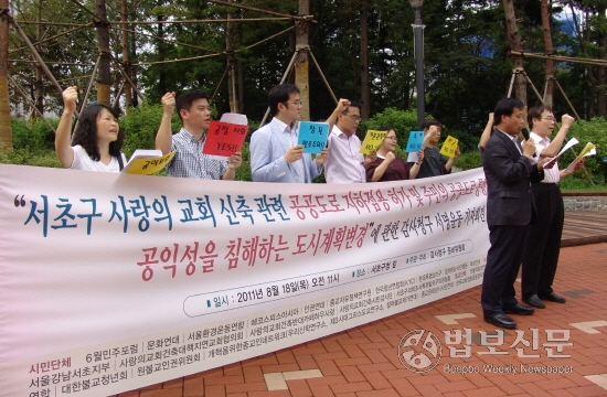 이날 기자회견에 앞서 사랑의교회건축대책지역교회협의회 황영익 목사는 동참발언에서 “언론보도 등을 통해 사랑의교회 건축허가는 명백한 권력형 특혜임이 드러났다”며 “이러한 후안무치한 특혜가 장로 대통령이 말하는 공정사회냐. 국민의 힘으로 사건의 전말을 밝혀야 한다”고 강조했다.