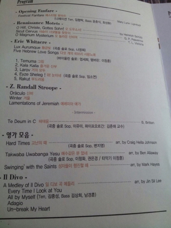 대구시립합창단은 이날 “도우소서, 하나님의 아들이여. 그리스도 최후의 수난을 통해 당신의 겸손을 봅니다”라는 가사가 담긴 ‘오 도우소서’를 비롯해 “목마른 사슴이 시냇가에서 물을 갈구하듯이 내 영혼도 하느님을 갈구하나니”라는 가사의 ‘사슴이 시냇물을 찾듯이’, “주 예수를 낳은 동정녀의 태를 축복하라, 할렐루야”라는 가사의 ‘오 놀라운 신비여’ 등 기독교 선교내용이 가득한 찬송가를 공연 내내 부른 것으로 알려졌다.
