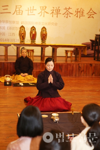 이렇다 보니 행사의 매 순간이 진지했다. 개막식에 이어 야외에서는 중국 북경 화정원(和靜園)이 ‘관음옥로(觀音玉露)’ 다법을 선보였다. 저녁 공양 후 다실에서는 한국 숙우회(熟盂會)가 헌다의식인 ‘사라수(娑羅樹)’와 헌다와 명상차가 포함된 ‘천처(淺處)’ 다법을 선보였다.