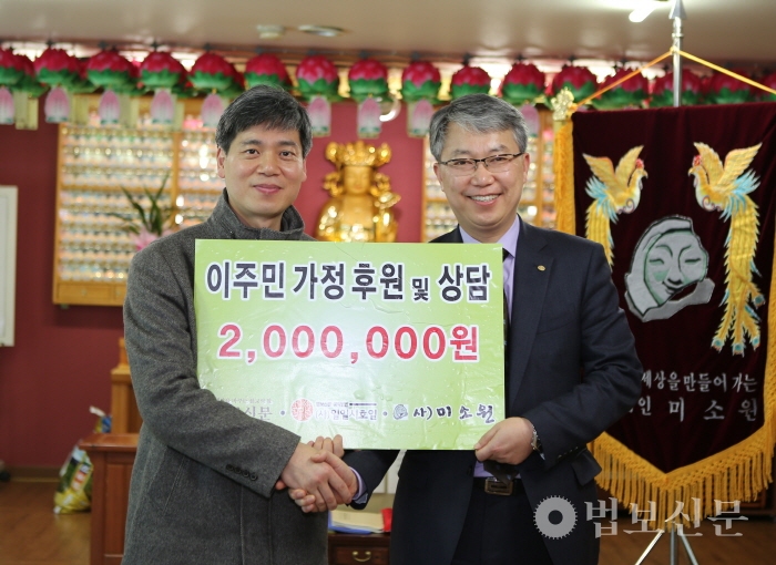 법보신문(대표 김형규)과 일일시호일(대표 심정섭)은 4월5일 사단법인 미소원(이사장 장유정)에 이주민 가정상담 등에 후원금 200만원을 전달했다. 후원금은 서울 조계사와 일일시호일이 법보신문 지면으로 펼치고 있는 이주민 돕기 공동 캠페인 기금 중 일부다. 지역 상담 및 봉사전문 단체 미소원을 통해 복지 사각지대에서 생활 중인 이주민들에게도 일정 부분 온정을 전하고자 결정된 후원이다.