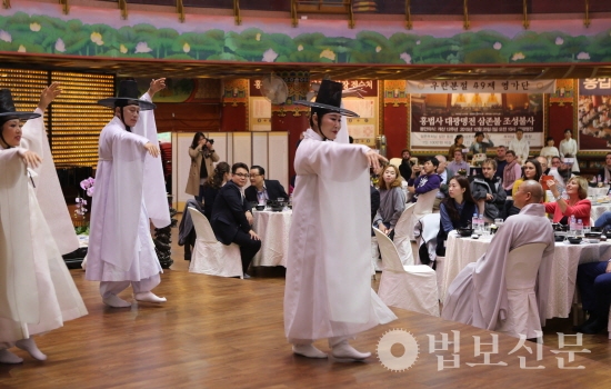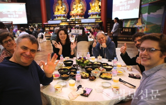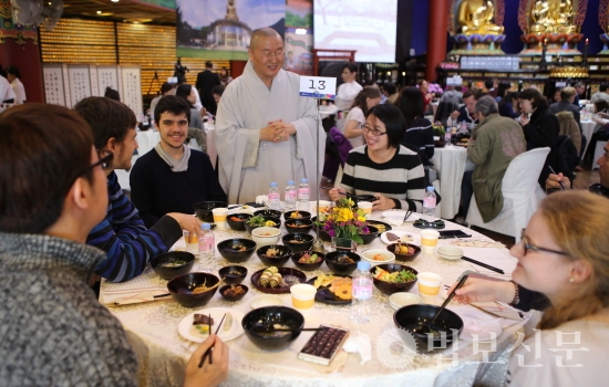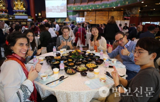 부산 홍법사(주지 심산 스님)는 10월28일 경내 대웅보전에서 ‘UN오케스트라 초청 한국 전통문화 체험 및 환영 오찬’을 가졌다. 이 자리에는 홍법사 주지 심산 스님, 원정희 부산 금정구청장, 양재생 홍법사 신도회장을 비롯해 보디안 골모 하마디 UN협회 세계연맹 사무총장 및 UN오케스트라 소속 67명의 단원 등 80여 명이 참석해 사찰음식의 직접 맛보는 시간을 가졌다.