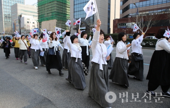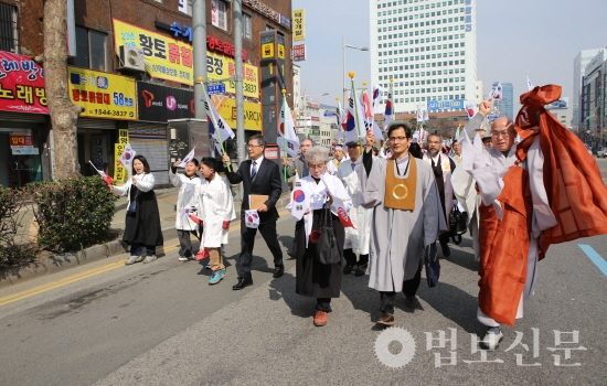 부산종교인평화회의(대표회장 목종 스님)는 3월1일 천도교 부산시교구청 및 부산역 광장에서 ‘제98주년 삼일절 기념식’을 봉행했다. 이 자리에는 부산종교인평화회의 대표회장 목종, 고문 정각 스님, 박차귀 천도교 공동회장을 비롯해 김영욱 천도교 부산교구 의장, 김대준 원불교 부산교구 주임, 부산 NCC위원 김홍숙 목사 등 각 종교를 대표한 지도자들이 참석했다. 또 부산 대광명사, 미룡사 신도들이 동참하는 등 사부대중 300여 명이 운집했다. 이날 종교지도자들과 참가자들은 천도교 부산시교구청에서 마련된 기념식에 동참한 데 이어 교구청에서 부산역까지 거리 평화 행진을 전개했다. 재가불자들은 흰 저고리와 검은색 치마를 착용해 독립만세운동을 재현해 눈길을 끌기도 했다.