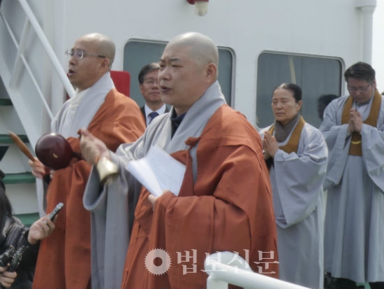 미수습자 한 사람 한 사람의 이름을 부르는 것으로 불교 의식이 시작됐다. 이름이 불려지자 미수습자 가족들은 눈을 감고 두 손을 모으고 눈물을 흘렸다. 목탁과 요령 소리가 바닷바람과 함께 세월호를 마주한 바다에 퍼져갔다.