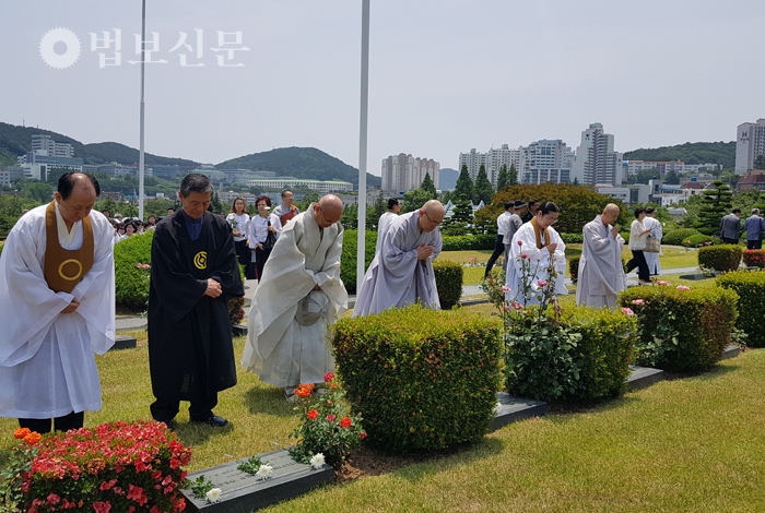 부산 종교인평화회의(대표회장 목종 스님)는 6월23일 부산 UN공원 일대에서 ‘유엔전몰장병 및 호국영령을 위한 합동위령제’<사진>를 봉행했다. 이 자리에는 부산종교인평화회의 대표회장을 맡고 있는 부산 대광명사 주지 목종 스님을 비롯해 불교, 기독교, 원불교, 유교, 천도교 등 5개 종단 종교 지도자 및 신도 등 300여명이 동참했다. 이날 위령제는 순국용사들의 호국 정신을 기리기 위한 종교지도자들과 각 종교 신도들의 추모 헌화, 각 종교 추모의식, UN묘지 참배 등의 순서로 이어졌다.